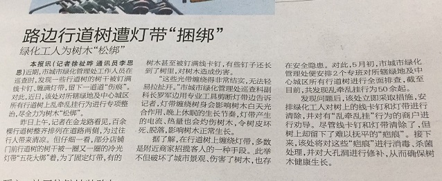 路邊行道樹遭燈帶“捆綁” 綠化工人為樹木“松綁”