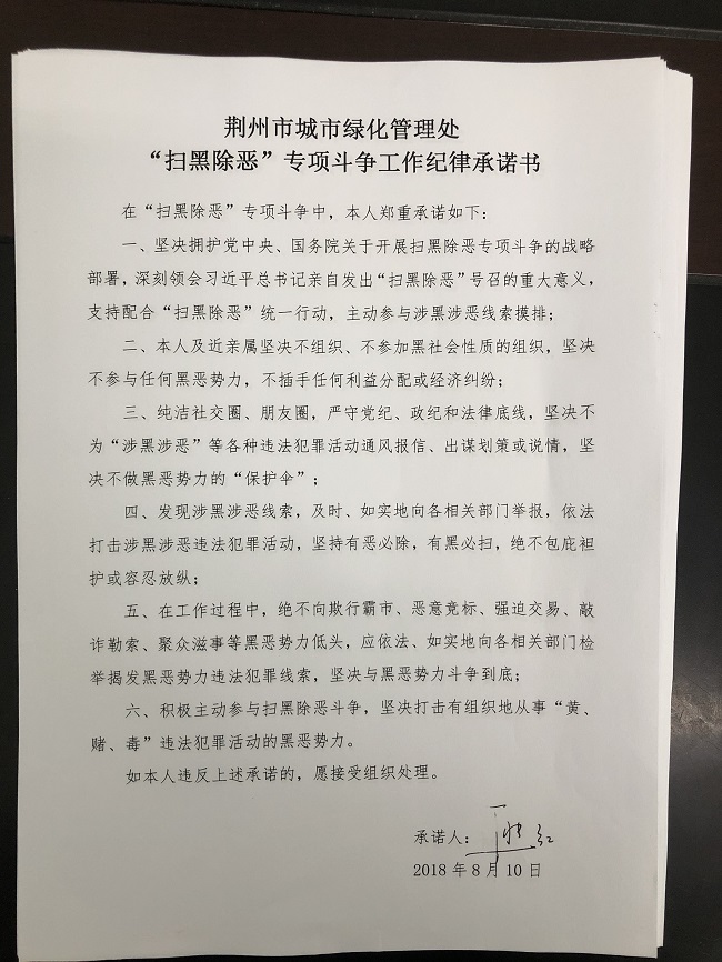之后,黨員同志們圍繞“掃黑除惡、勇當(dāng)先鋒”主題開展了討論,進一步統(tǒng)一了思想認識,紀律意識、規(guī)矩意識、責(zé)任意識得到強化,為堅決打贏掃黑除惡專項斗爭攻堅戰(zhàn)提供了思想和紀律保障。 最后,綠化處全體黨員同志簽訂了《“掃黑除惡”專項斗爭工作紀律承諾書》?!冻兄Z書》從6個方面規(guī)定了掃黑除惡工作中需要遵守的紀律,要求全體干部職工自覺投身掃黑除惡專項斗爭,積極配合做好掃黑除惡專項斗爭,以身作則,帶頭遠離黑惡勢力,并對發(fā)現(xiàn)和掌握的涉黑涉惡違法犯罪及苗頭,及時向單位舉報。同志們紛紛表示,要切實履行承諾,筑牢防線、不踩紅線、守住底線,本著對組織、對家庭負責(zé)的態(tài)度,嚴格要求自己,勇于擔(dān)當(dāng)、敢于碰硬,自覺同黑惡勢力做斗爭,發(fā)揮先鋒模范作用,推動綠化處“掃黑除惡、勇當(dāng)先鋒”專項斗爭工作向縱深發(fā)展。