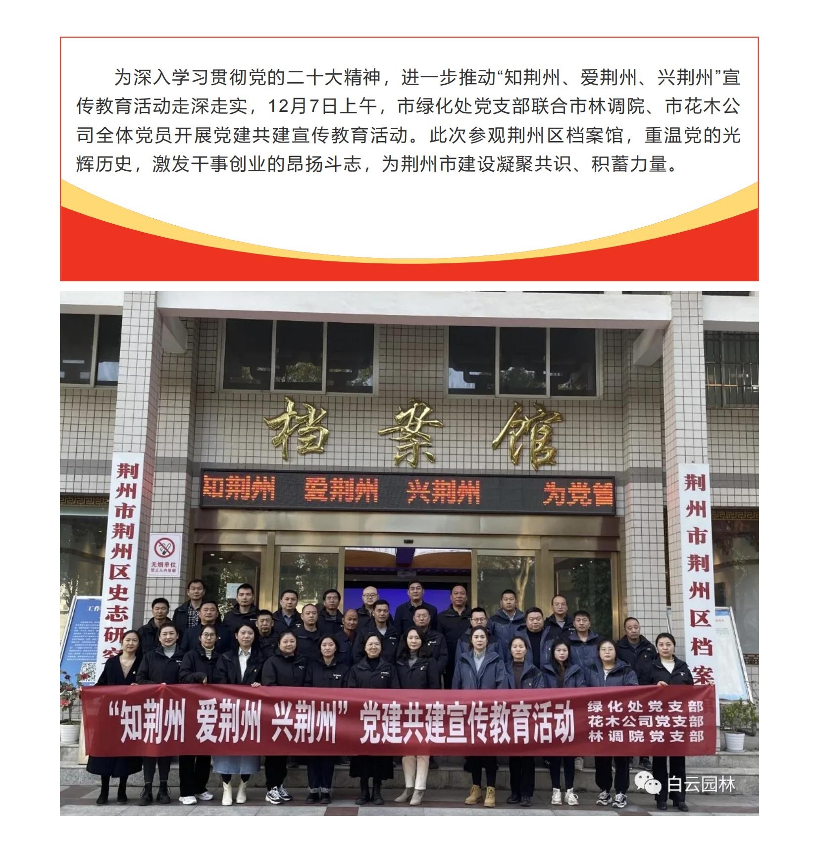 綠化處黨支部聯(lián)合市林調(diào)院、市花木公司黨支部開展“知荊州、愛荊州、興荊州”宣傳教育活動