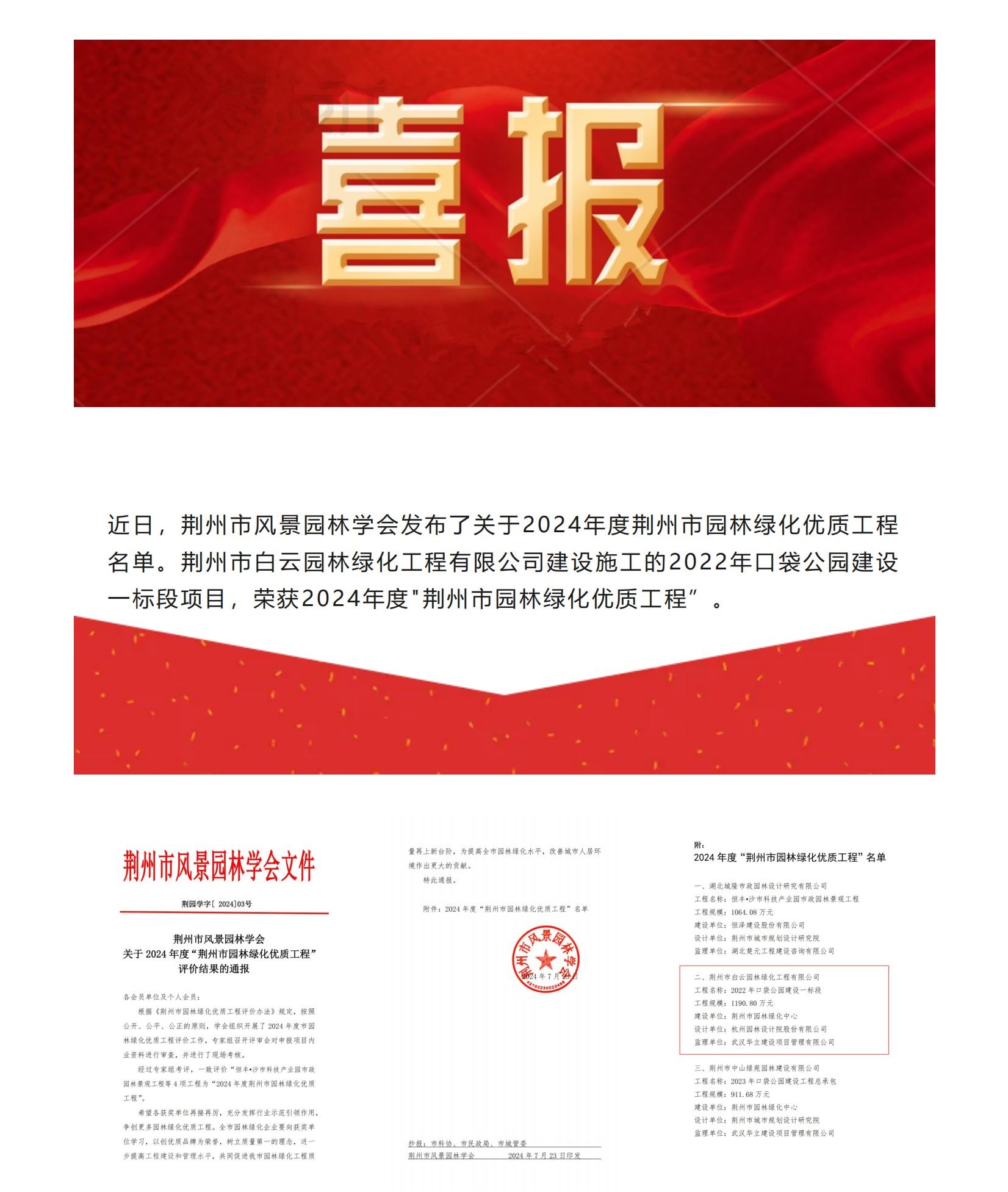 喜報(bào)|白云園林榮獲荊州市風(fēng)景園林學(xué)會(huì)優(yōu)質(zhì)工程獎(jiǎng)項(xiàng)